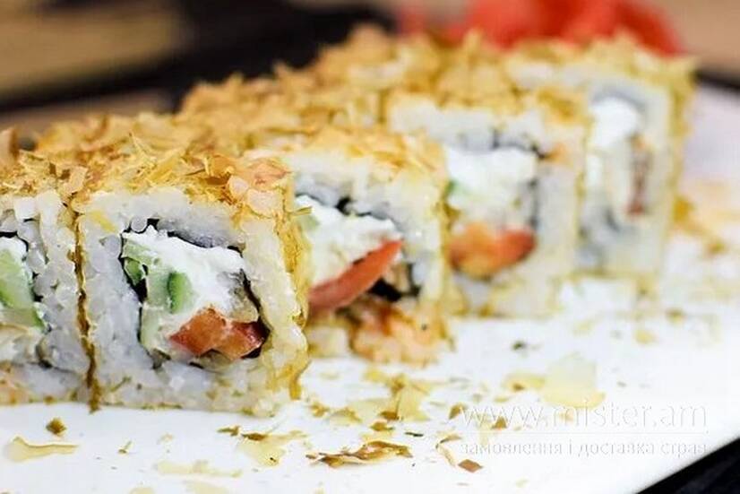 Рис, норі, вугор, огірок, соус гострий, перець болгарський, сир Філадельфія, цибуля зелена, стружка тунця.