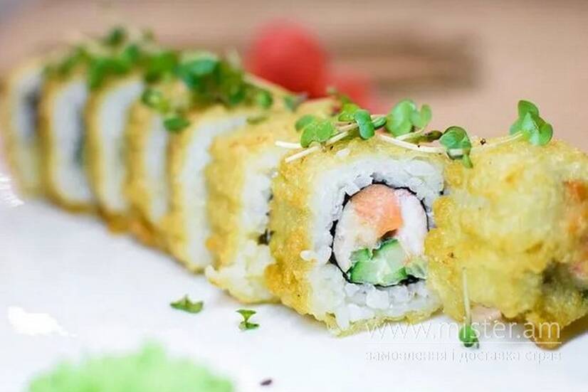 Рис , норі, тигрова креветка , огірок, лосось, майонез, тісто Темпура.