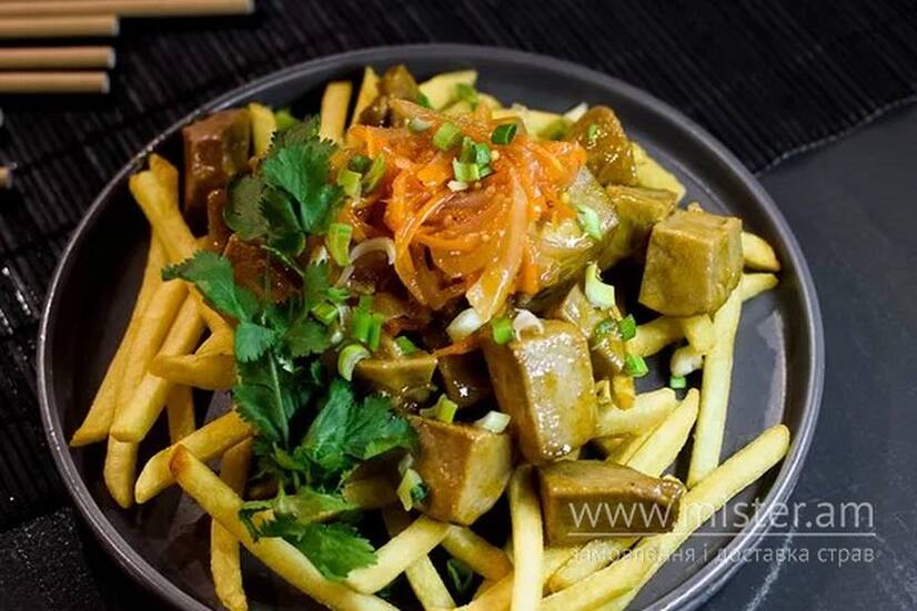 Свинина, ачар-рампай, картопля фрі, соус Спайсі,кінза, зелена цибуля.