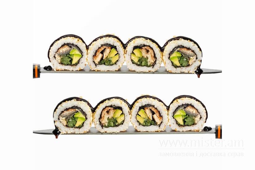Подвійний вугор, авокадо, огірок, соус унагі, кунжут, мигдаль.