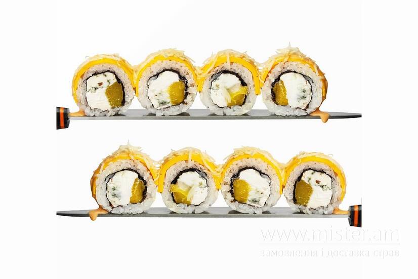 4 сири: Чедер, Рокфор, Пармезан, Філадельфія, манго, соус манго чилі.