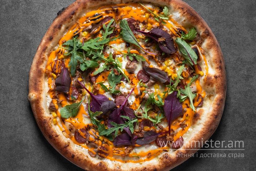 До печі: вершковий соус, моцарела тверда, мисливські ковбаски, кукурудза, куряче бедро. Після печі: мікс зелені, сушені томати, цибуля фрі, сирний соус.
