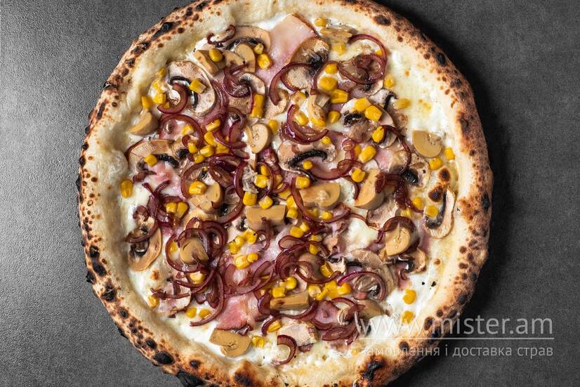 До печі: вершковий соус, моцарела тверда, кукурудза, шампіньйони мариновані, печериці, бочок копчений, цибуля маринована. Після печі: часникова олія.