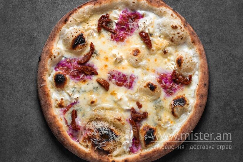 До печі: вершковий соус, моцарела тверда,сир горгондзола, Філадельфія, сир з лавандою. Після печі: сир пармезан,в`ялений помідор.