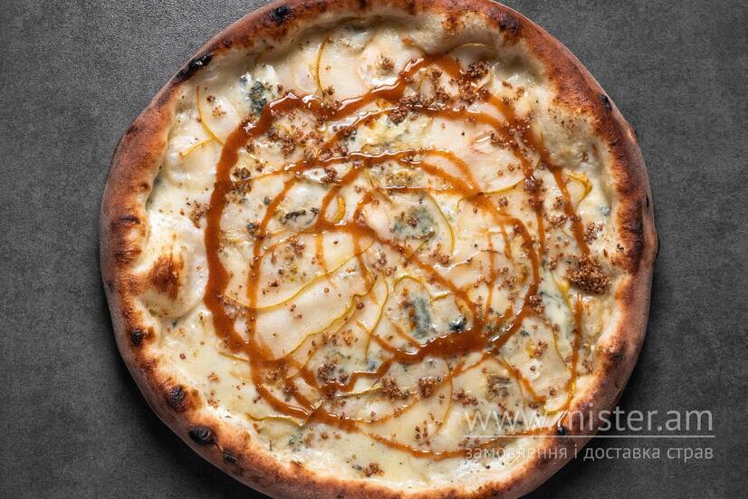 До печі: моцарела тверда, груша, сир дорблю, вершковий соус, пармезан. Після печі: горіхи, гострий мед.
