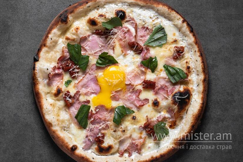 До печі: вершковий соус, моцарела тверда, шинка копчена, бочок копчений. Після печі: базилік, пармезан, жовток, в`ялені томати.