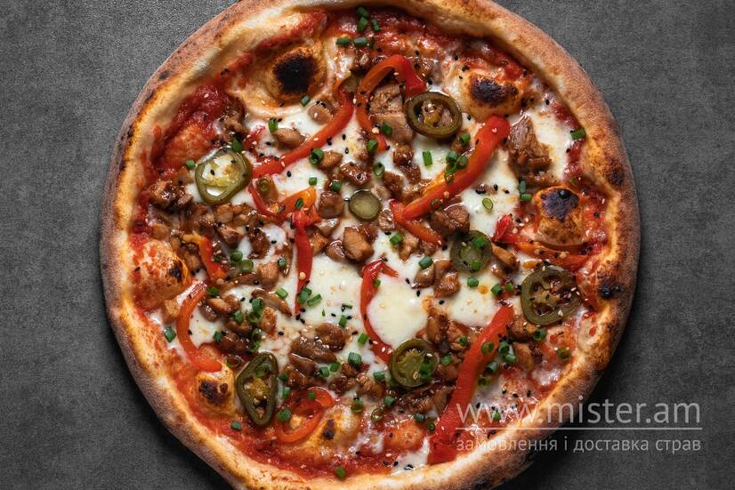 До печі: томатний соус, моцарела тверда, курка теріякі, халапеньйо, перець печений. Після печі: кунжут, зелена цибуля.