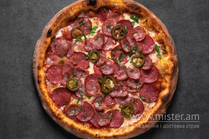 До печі: два види салямі, томатний соус, моцарела тверда, халапельйо. Після печі: петрушка.