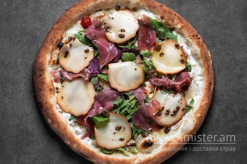 Сир твердий, шинка копчена, печериці свіжі, томати чері, прошутто шинка, сир копчений, олія трюфельна, зелень, вершковий соус.