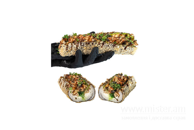 Рис, норі, томаго, крем сир, чука, авокадо, огірок, вугор, соус унагі, кранч, темпура.