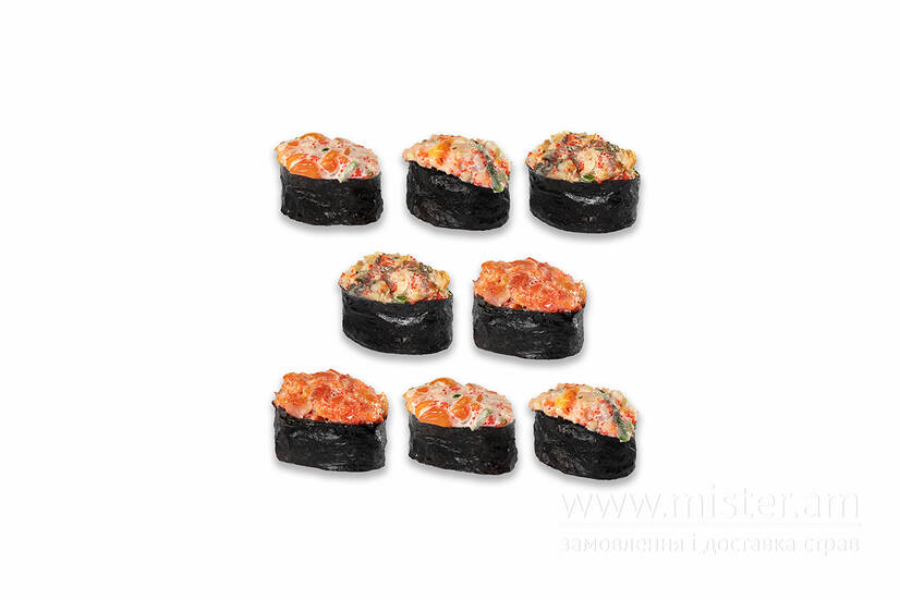 З лососем (2 шт.) , з вугрем (2 шт.), з тунцем (2 шт.), з креветкою (2 шт.).