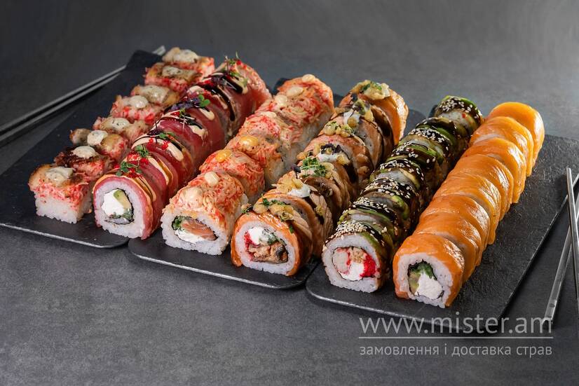Філадельфія з лососем, кранч рол з лососем та вугрем, спайсі рол з сніжним крабом, Зелений дракон, оші суші з вугрем, рол з тунцем чілі майо.