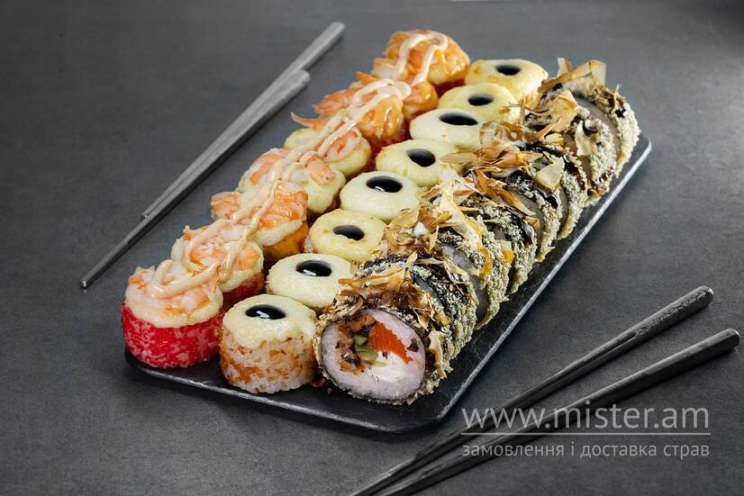 Запечений з креветкою, запечений з вугрем, смажений футомакі з лососем та вугрем.