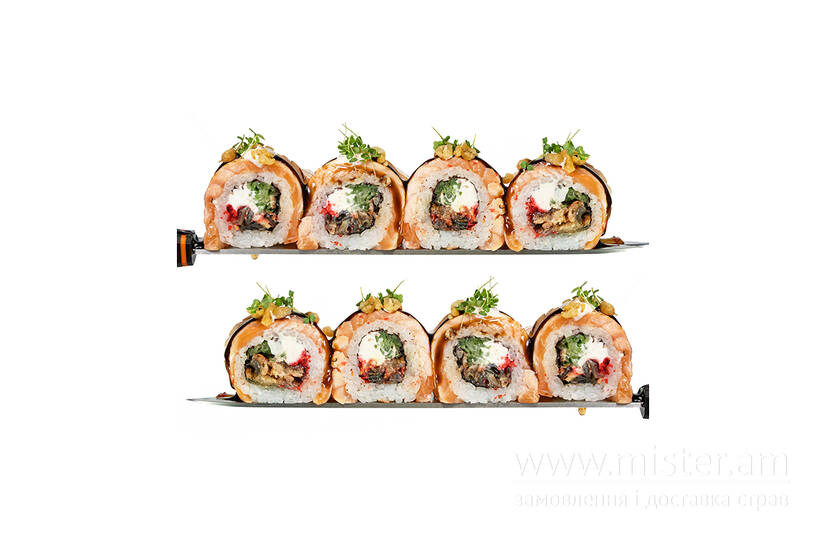 Рис, норі, вугор, крем сир, огірок, лосось, трюфельний майонез, кранч з темпури, соус унагі.