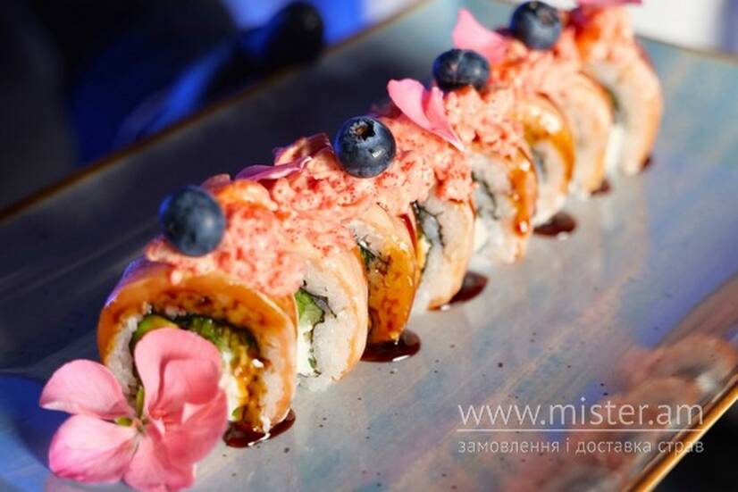 Рис, норі, крем-сир, огірок, авокадо, лосось, соус Чилі майо, креветка, соус Унагі соус, солодкий чілі юзу, лохина, їстівні квіти.