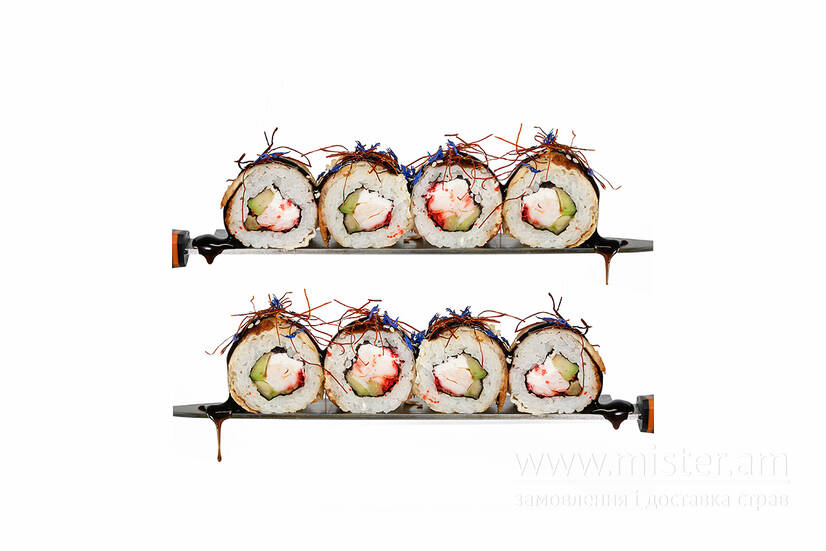 Рис, норі, креветка, авокадо, тобіко, крем сир, вугор, соус унагі, нитка чілі, кунжут.