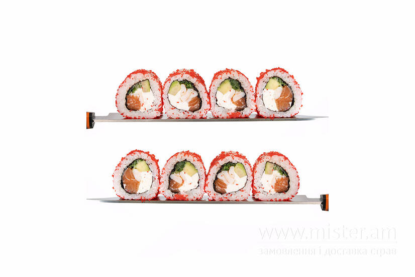 Рис, норі, креветка, лосось, крем сир, огірок, авокадо, тобіко.
