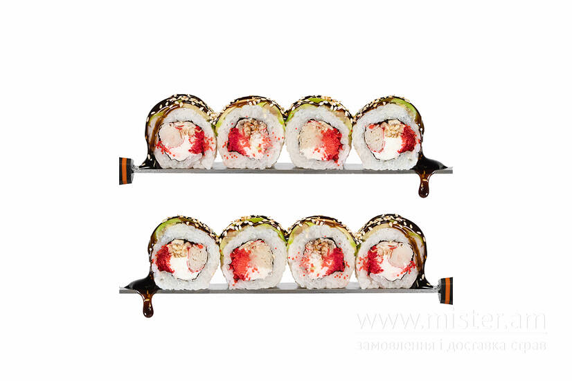 Рис, норі, вугор, тобіко, сніжний краб, крем сир, авокадо, соус унагі, кунжут.