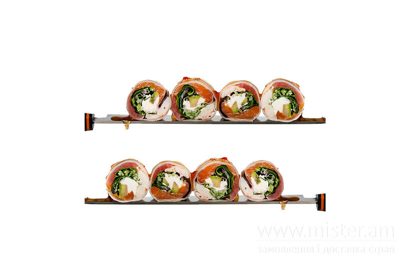 Рисовий папір, лосось, тунець, креветка, крем-сир, огірок, авокадо, мікс салату, соус юзу, унагі.