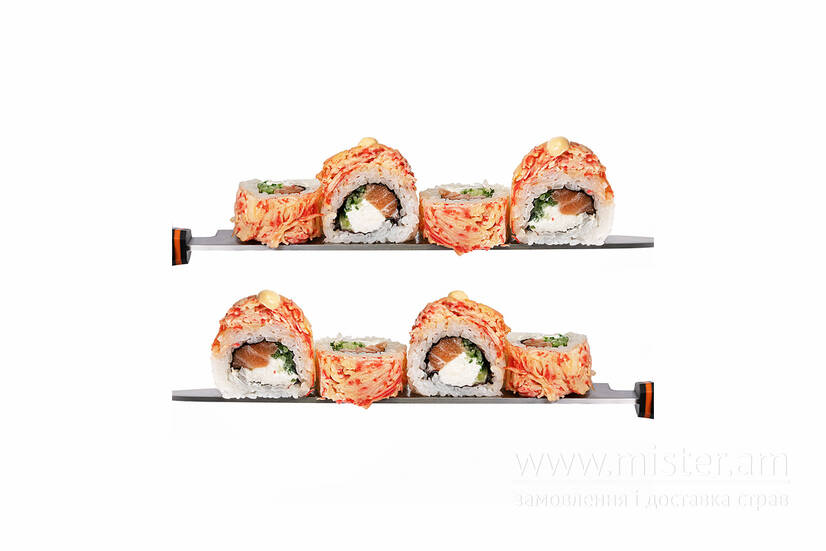 Рис, норі, лосось, огірок, сніжний краб, чілі, майонез, тобіко.