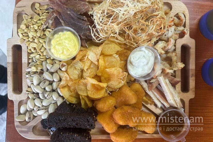 Креветки, нагетси, грінки, філе кальмара, фісташка, арахіс, джерки, чечель печений, чіпси, соус.