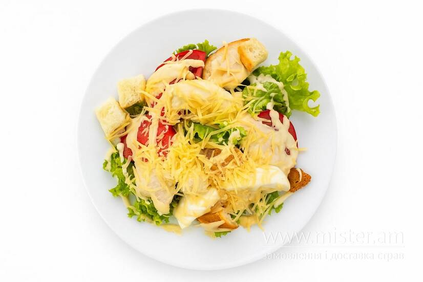 Листя салату, філе куряче, помідор, багет, яйце, сир, майонезна заправка.