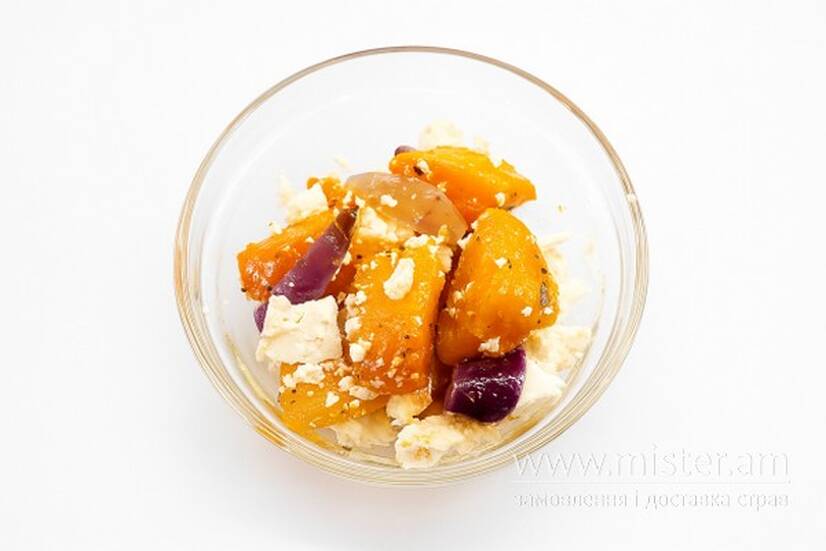 Гарбуз печений, цибуля синя печена, фета, заправка.