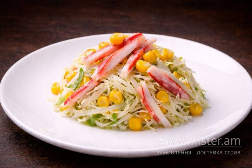 Капуста пекінська, кукурудза консервована, крабові палички, майонез, спеції.
