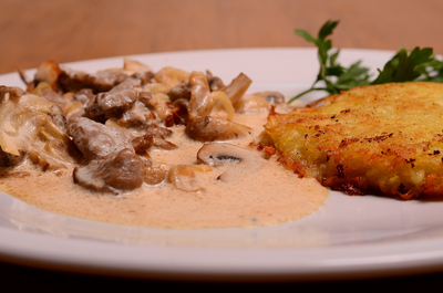 вирізка теляча з шампіньонами під вершковим соусом доповнена Максі дранніком
