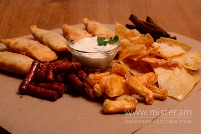 Міні чебуреки,ковбаски смажені, чіпси домашні, смажений сир чечель,гріночки бородинські,соус.