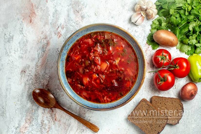 Буряк, цибуля, морква, капуста, олія рослинна, сметана, бульйон, спеції, м`ясо.