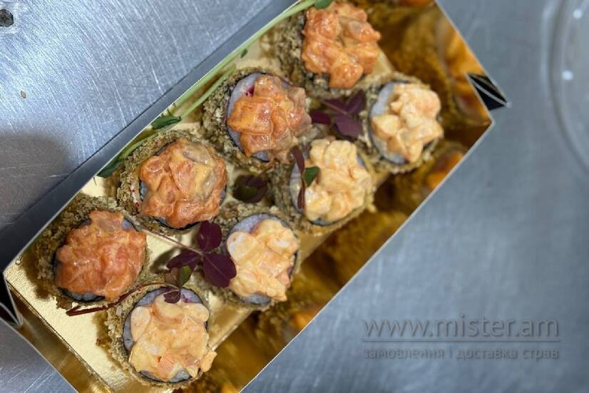 Хрусткий рол, з тунцем в середині та ніжна шапочка з креветки в пікантному соусі спайсі