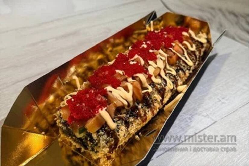 Суші хот-дог з лососем, тунцем, крем сиром, авокадо, огірком, политий соусом унагі та спайсі, та прикрашений ікрою масаго.