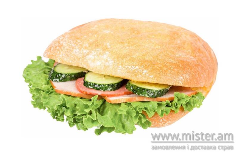Хліб чіабата, соус сирний , ковбаса салямі, балик, огірок свіжий, лист салату Lollo Bionda