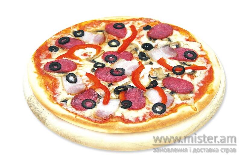 Балик, сир моцарелла, шампіньйони свіжі, ковбаса салямі « Пепероні », перець солодкий , маслини без кісточок