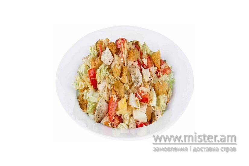 Капуста пекінська, куряче філе, яйце варене, сир моцарелла, томат свіжий, сухарі