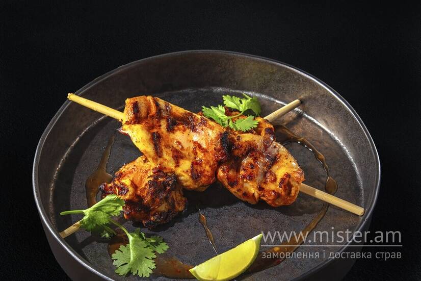 Шашлик з курячого стегна, часник, копчена паприка, паста Том Ям, лайм, соус солодкий чілі.