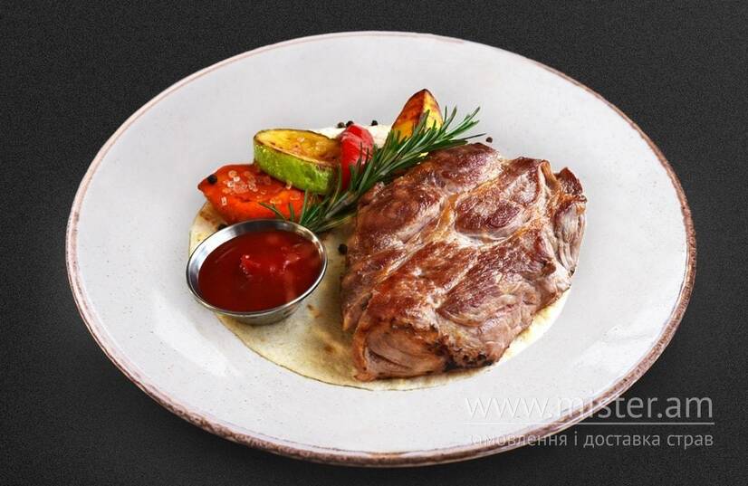Стейк зі свинини, лаваш, морква відварена, соус барбекю.