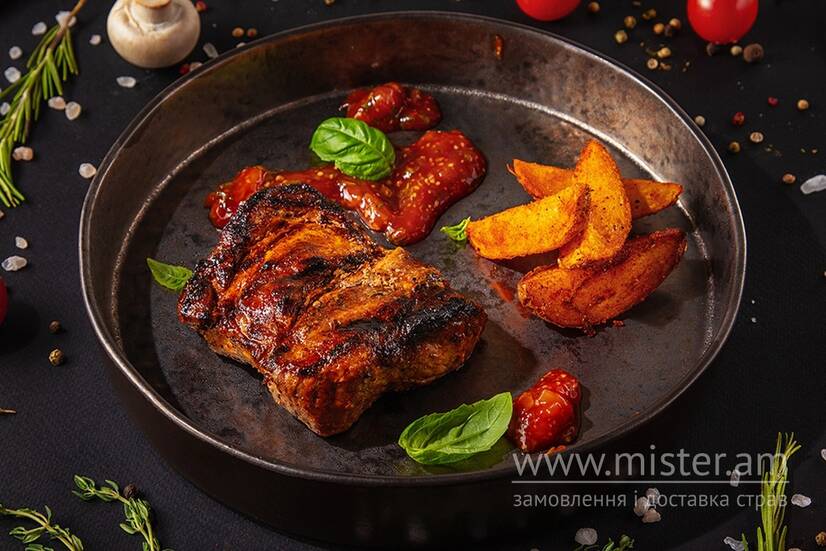 Стейк зі свинного ошийку, копчена паприка, часник, картопля дольками, соус барбекю-ананас.