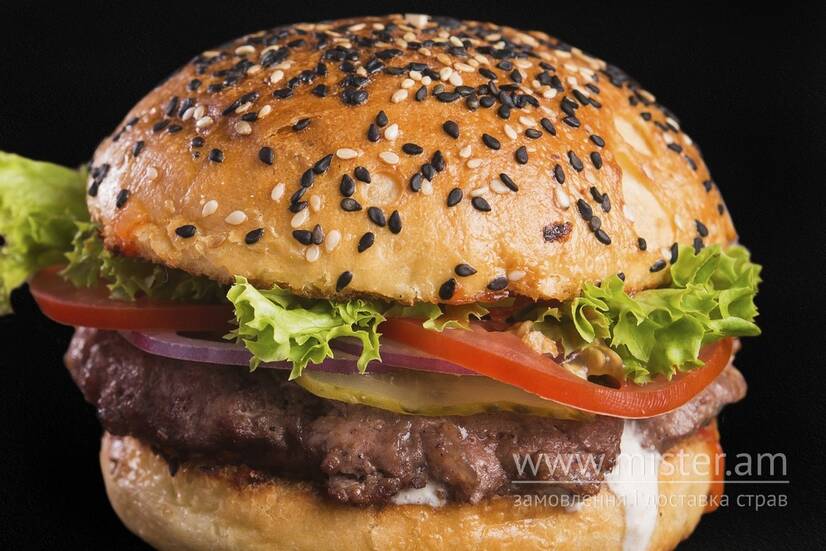 Хрустка булочка, котлетаз яловичини, салат Айсберг, мариновані огірки, кільця червоної цибулі, помідори.