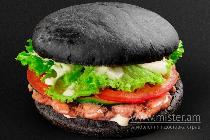 Булка чорна, цибуля червона, томати свіжі, мікс салата, соус Тар-Тар, сир тостовий, котлета з яловичини, огірок маринований, кетчуп, картопля по-селянськи.