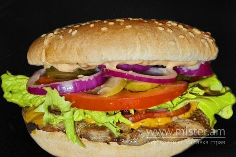 Котлета з яловичини, булка біла велика, мікс cалату, сир тостовий, томати свіжі, печериці смажені, цибуля червона, соус фірмовий.