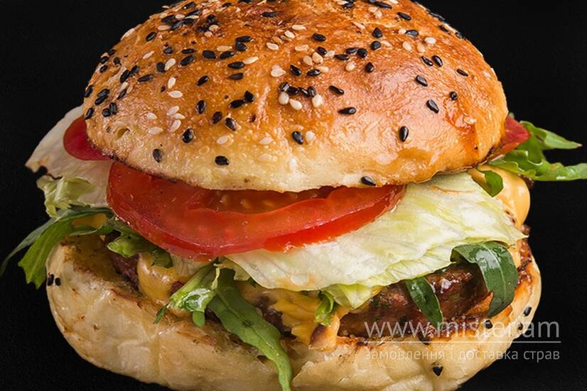 Булка біла велика, котлета зі свинини, бекон, томати свіжі, мікс салату, соус барбекю, сир Дор Блю