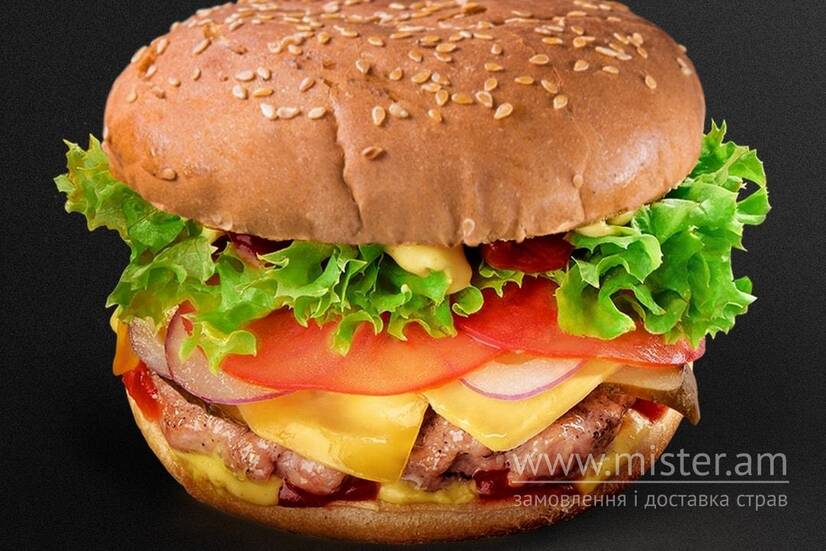 Куряча котлета, булка біла велика, мікс Салату, сир тостовий, томати свіжі, майонез, цибуля червона, огірок маринований, кетчуп, картопля по-селянськи.