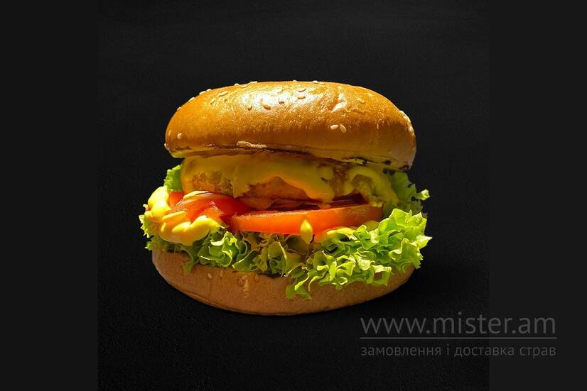 Булка біла велика, котлета зі індички, томати свіжі, огірок свіжий, мікс салату, цибуля червона, сир тостовий, соус бургерний та соус французький