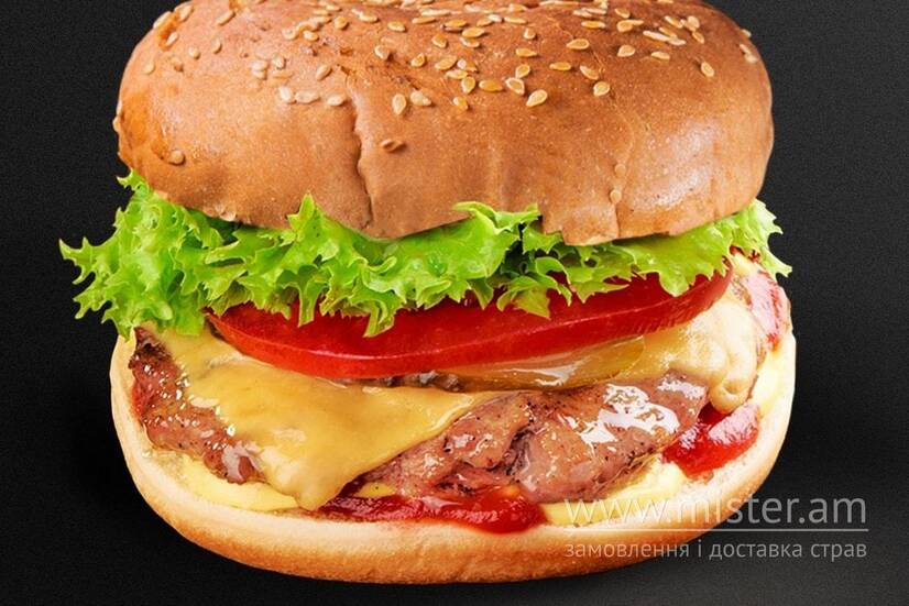 Булка біла маленька, томати свіжі, огірок маринований, мікс салата, цибуля червона, соус французький, кетчуп, сир тостовий, котлета з яловичини та свинини, кетчуп, картопля по-селянськи.