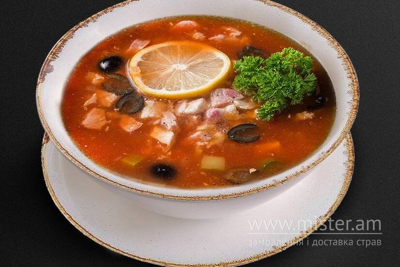 Куряче філе, свинина, ковбаски, цибуля, томатна паста, маринований огірок, курячий бульйон, маслини, лимон, сметана, хліб.