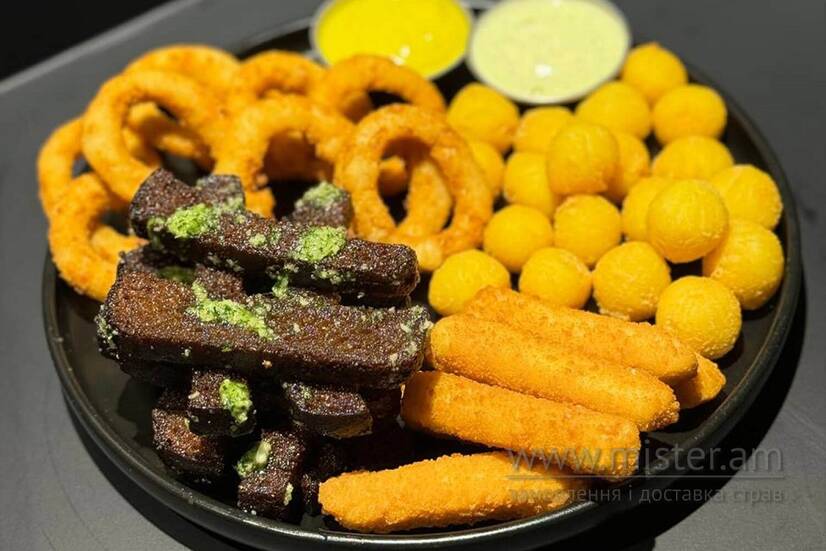 Цибулеві кільця, сирні палички, грінки, картопляні кульки, часниковий соус