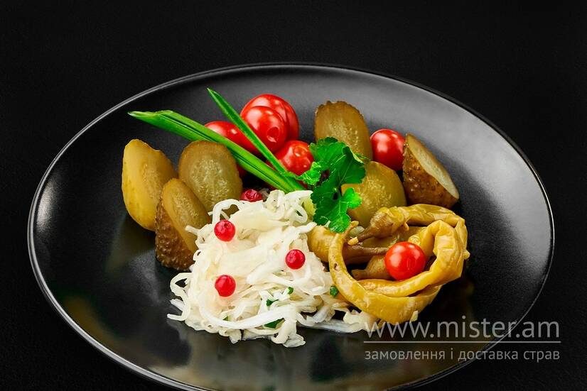 Огірок маринований, помідор маринований, капуста маринована, гриби мариновані.