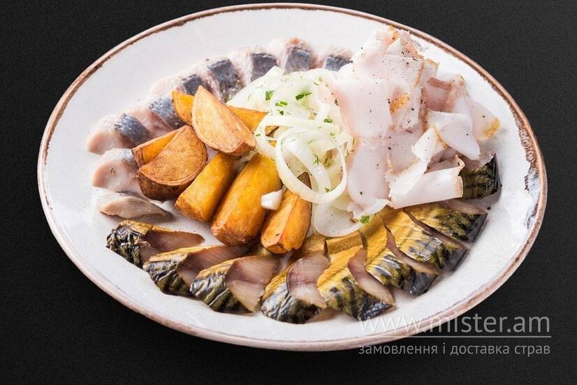 Філе оселедця, скумбрія х/к, сало, картопля по-селянськи, олія часникова, цибуля маринована.